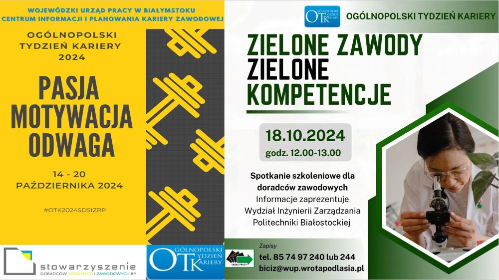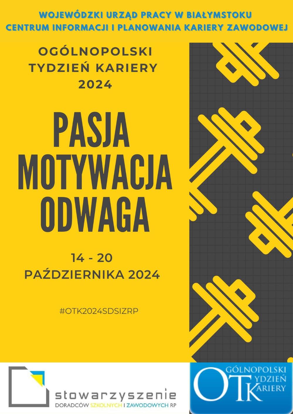 Od 14 do 20 października 2024 r. obchodzony był Ogólnopolski Tydzień Kariery (OTK). Tegoroczna edycja odbyła się pod hasłem: „Pasja – Motywacja - Odwaga" Wojewódzki Urząd Pracy w Białymstoku wraz z Powiatowymi Urzędami Pracy województwa podlaskiego przyłączył się do tej inicjatywy, celem promowania działań doradców zawodowych na rzecz planowania i budowania ścieżek karier oraz wzmacniania motywacji i odkrywania talentów, tak bardzo potrzebnych na rynku pracy.